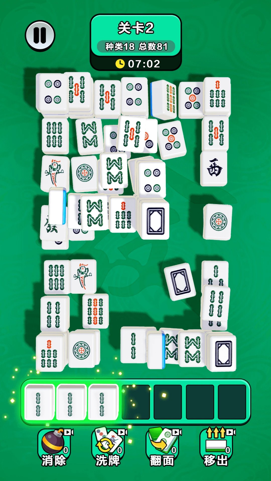 3. 观察关卡目标:经典模式需在时间结束前消除指定数量方块,限时挑战需完成特定任务(如消除50个红色麻将),新手需根据目标调整策略,避免盲目消除。