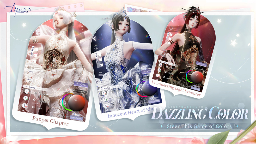 2. 战力系统与染色机制:服装评分是核心战力来源,每件衣服初始8个染色盘,扩展后可达16个,每开8个盘可获百分比评分加成。高星大件(如长裙、头发)优先开盘收益最高,但需积攒色卡;低氪玩家可聚焦“斑斓度”属性,通过制作章节套服装实现性价比最大化。