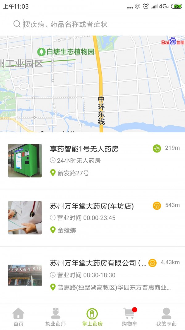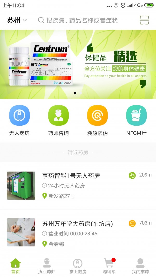 2. 附近药房搜索:提供附近药房的快捷搜索功能,方便用户日常买药、送药。