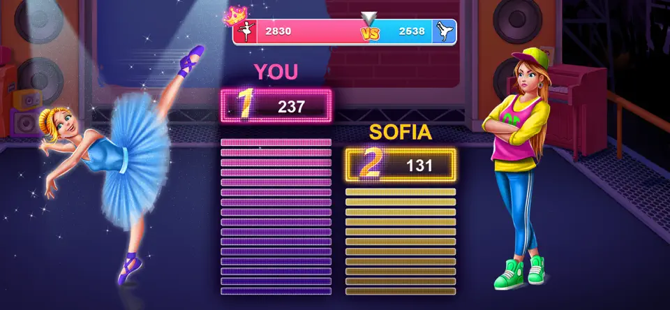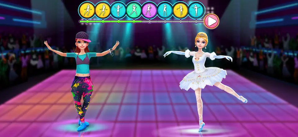1. 双阵营差异化体验:芭蕾阵营以优雅动作与华丽服饰为核心,强调动作流畅性与节奏精准度;街舞阵营则突出动感节奏与潮流穿搭,动作设计更具爆发力。玩家可根据兴趣选择阵营,体验截然不同的舞蹈风格与视觉效果。