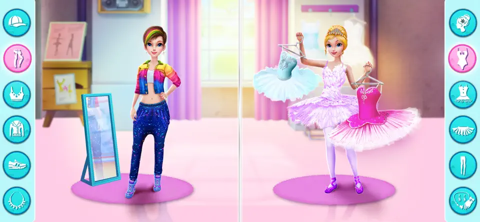 2. 高自由度角色定制:游戏提供超过200种服饰配件,涵盖发型、妆容、服装、配饰等维度,支持玩家自由组合搭配。例如,芭蕾阵营可搭配蓬蓬裙与芭蕾舞鞋,街舞阵营则可选择破洞牛仔裤与运动帽,满足个性化审美需求。