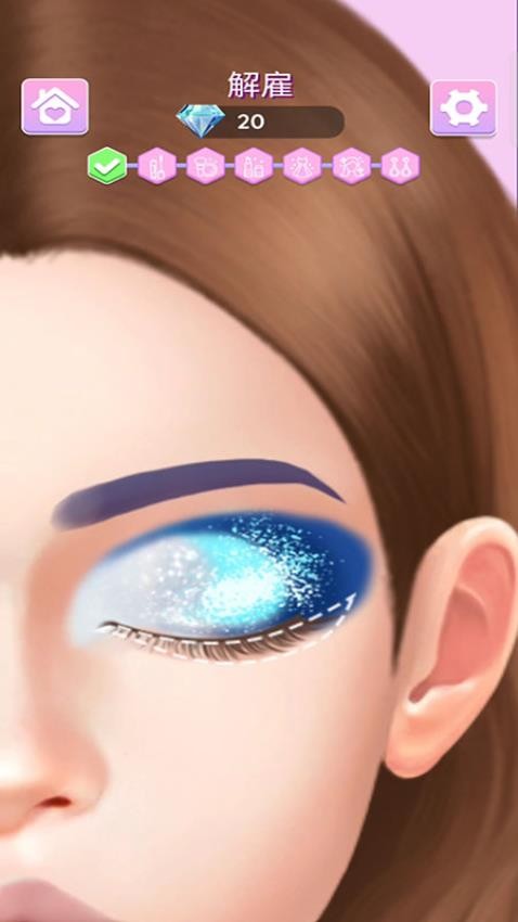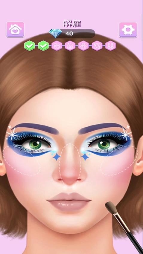 1. 分步化妆系统:玩家需依次完成底妆、眼妆、唇妆等步骤,例如用美妆蛋拍粉底液、根据虚线范围涂眼影、在鼻梁与脸颊涂高光,最后选择口红颜色沿唇形描边。
