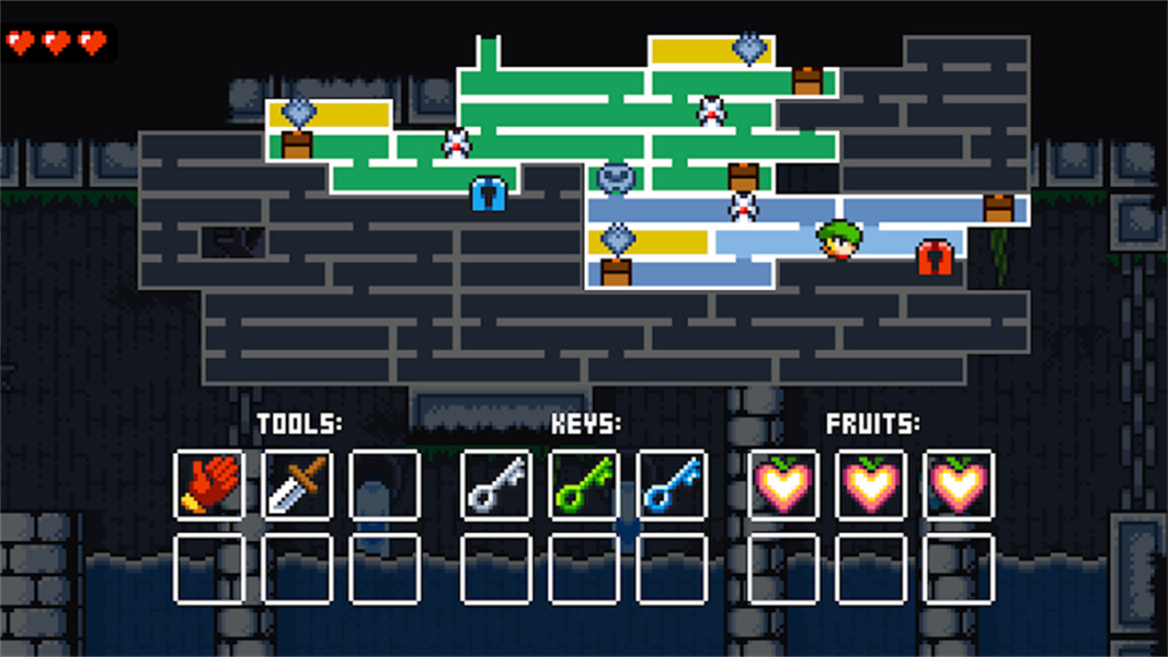 地牢中散落着金币、能量碎片与隐藏道具。金币可用于购买装备,能量碎片可解锁新技能或升级现有能力(如延长冰冻符文持续时间)。角色属性包括血量、移动速度与跳跃高度,玩家可通过装备“轻便靴”提升敏捷度,或佩戴“生命护符”增加血量上限。