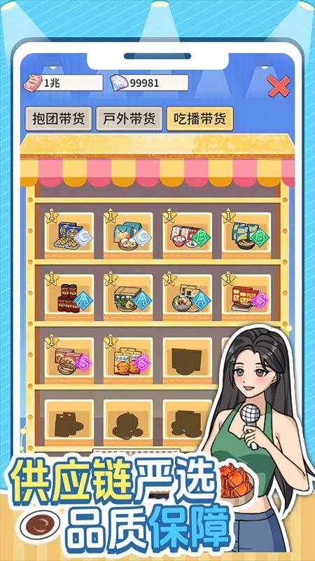 《带货王来了免测试版》是一款以直播带货为核心玩法的安卓模拟经营手游,玩家将化身重生后的创业者,从天桥摆摊式直播起步,通过招募主播、策划直播内容、优化供应链、分析市场数据等策略,逐步打造行业顶尖的带货帝国。游戏以精美的卡通画风构建了一个充满活力的商业世界,真实还原了从选品谈判、直播间装修到粉丝互动、突发状况处理的完整直播生态链。玩家不仅能体验高颜值主播吸引流量、专业解说提升转化率的团队搭配乐趣,还能通过沙漠探险、深夜美食等创新场景直播突破传统模式,结合实时数据分析工具动态调整商品策略,沉浸式感受从新手主播到顶流带货王的成长历程。