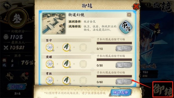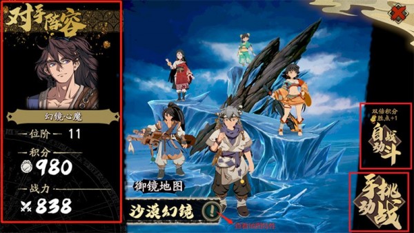 1、战斗准备界面可以查看对手阵容、御镜地图,对手阵容包括对手上阵英灵、对手队伍位阶、对手总战力;御镜地图可通过点击地图旁的【!】查看该地图特性。