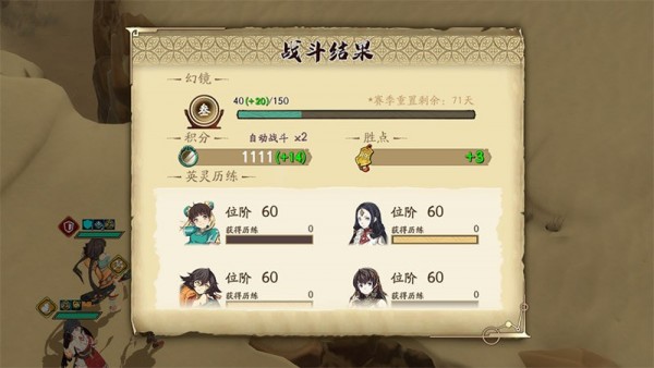 4、战斗结算:战斗胜利将获得【幻镜历练值】、【幻镜积分】、【胜点】;战斗失败将获得少量【幻镜历练值】,扣减【幻镜积分】,不增加【胜点】。