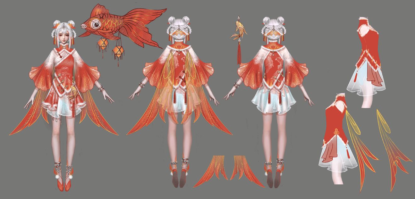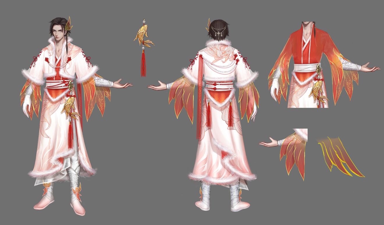 当然,本期的最大亮点必须是我们的【锦鲤时装】,说到这套时装,真的忍不住要给大家安利一下,这套时装采用了红白配色,活泼而不失优雅。在设计上也很讲究,有很多暗纹,金边和刺绣的元素,女生这套更是增添了珍珠、盘扣、丝纱和银饰的装饰~精致又可爱,搭配衣服上金闪闪的亮片和可爱的双啾啾发型,已经少女心爆棚。