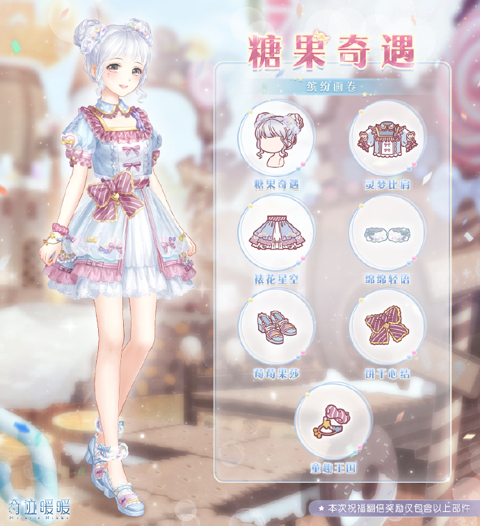 此外,每天都可以选择花费一元进行祝福,将当日的钻石翻倍哦~祝福达到一定次数,还可领取对应的服装奖励,收集缤纷画卷系列套装【糖果奇遇】!