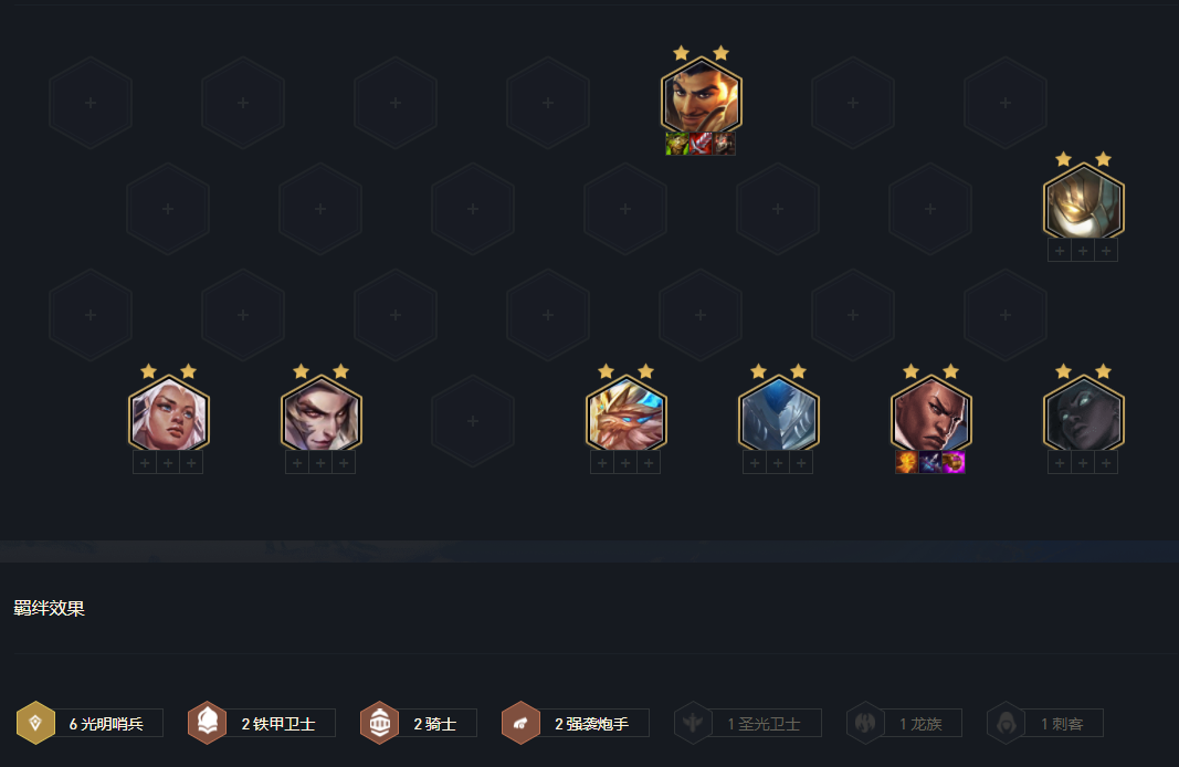 阵容关键羁绊,6哨兵+2铁甲+2骑。