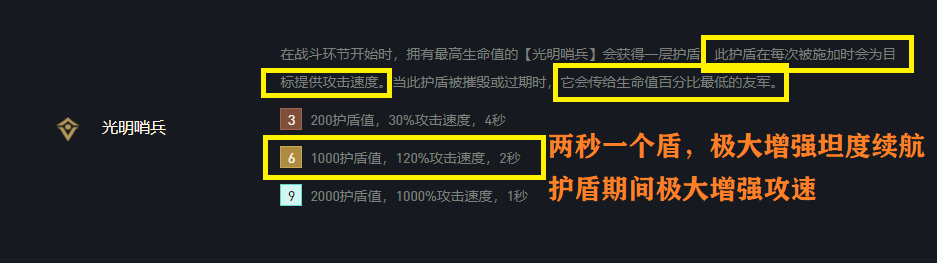 6哨兵基本能2秒为阵容百分比血量最低棋子增加1000护盾这让阵容棋子续航能力极大增强,变相增强阵容坦度加上2铁甲与2骑士阵容坦度极高。另一方面6哨兵羁绊触发的护盾期间还能为棋子增加120%攻速,这让阵容输出能力大大加强。