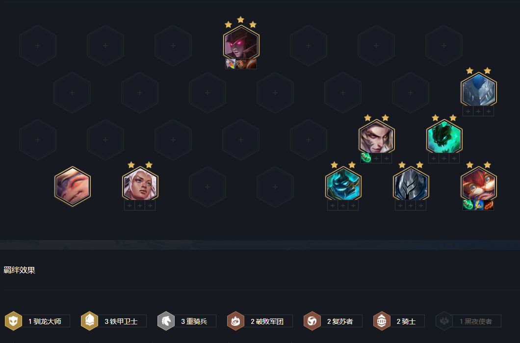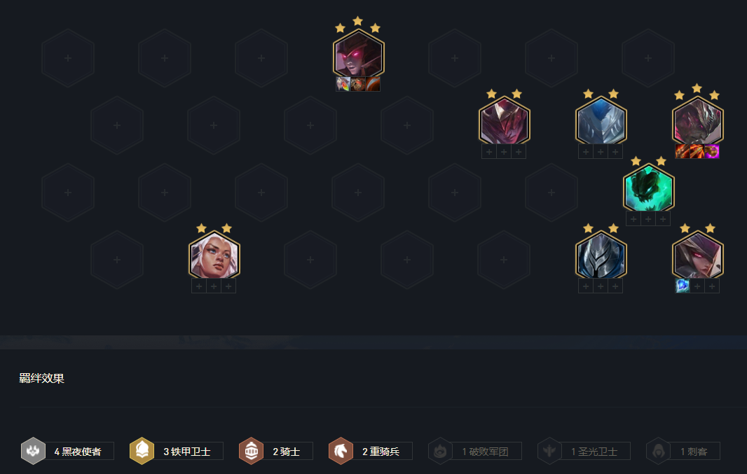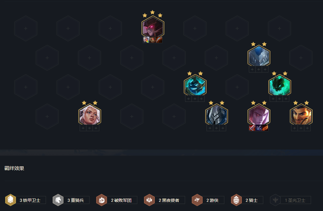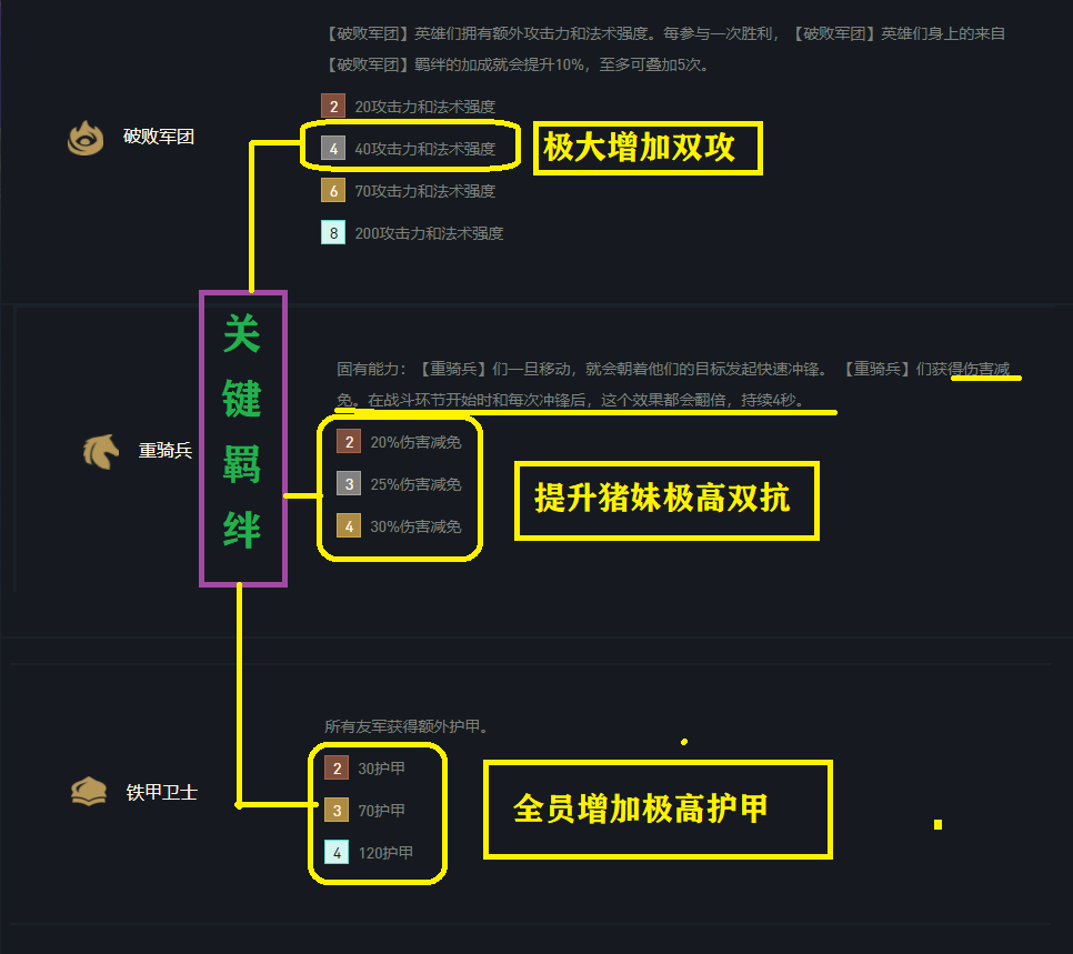阵容关键羁绊:3/4重骑兵+2/3铁甲+4破败。