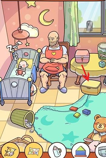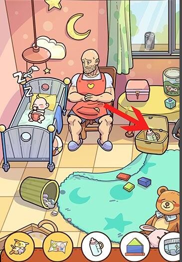 6、点击奶爸口袋里的钥匙,开启桌子上的箱子,点击尿不湿收起。