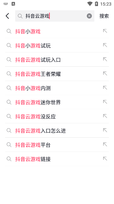 打开抖音,在搜索框输入“抖音云游戏”,点击第一个抖音小游戏选项