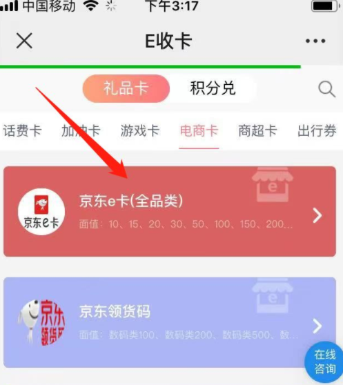 五、在电商卡菜单中选择→京东E卡(全品类)