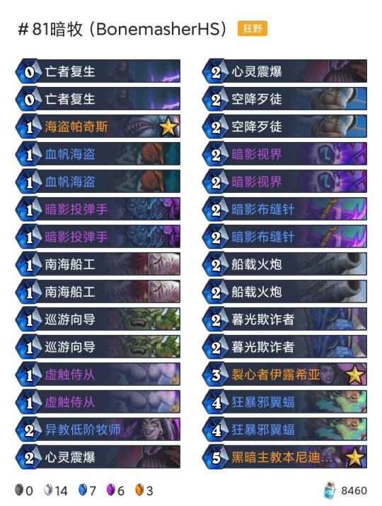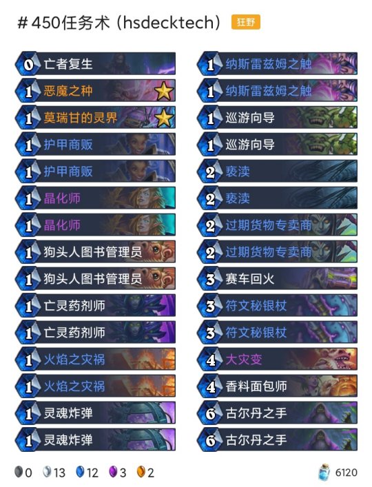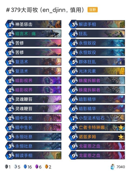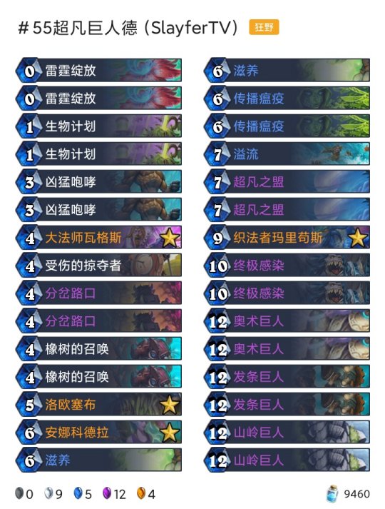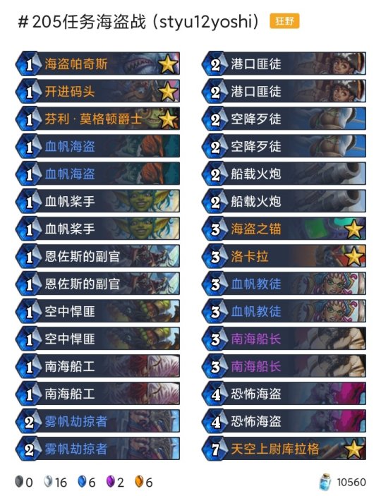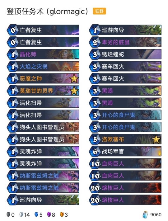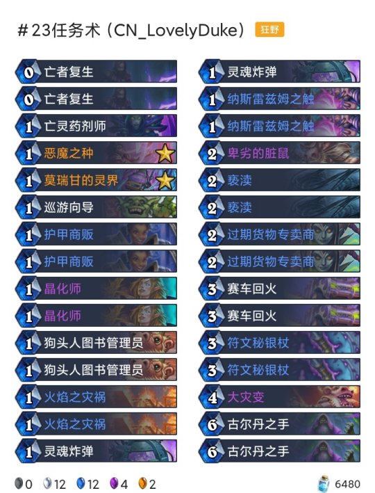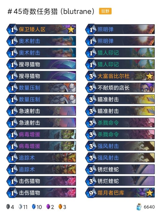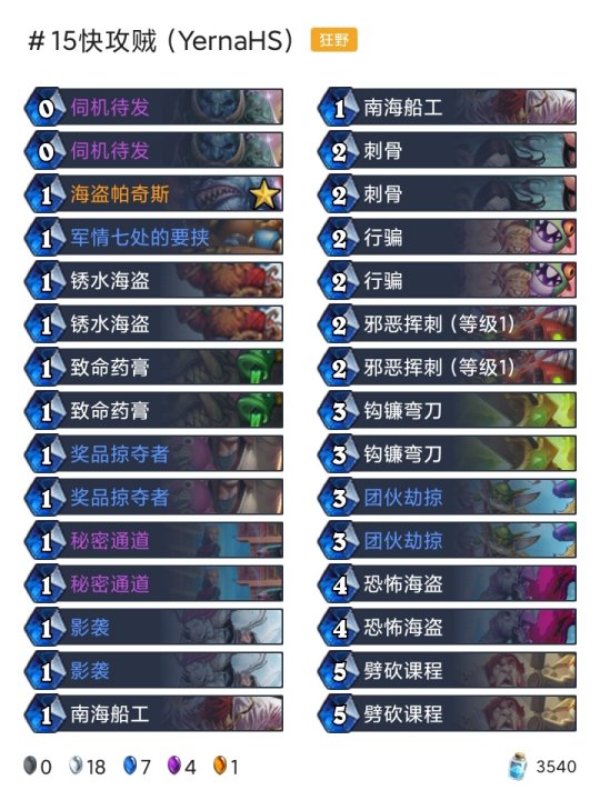 ◆术士:任务术(登顶),任务术(传说23),任务术(传说33),任务术(传说450) ◆潜行者:快攻贼(传说15),海军贼(传说168) ◆猎人:奇数任务猎(传说45) ◆德鲁伊:超凡巨人德(传说55) ◆战士:任务海盗战(传说205) ◆牧师:暗牧(传说81),大哥牧(传说379)