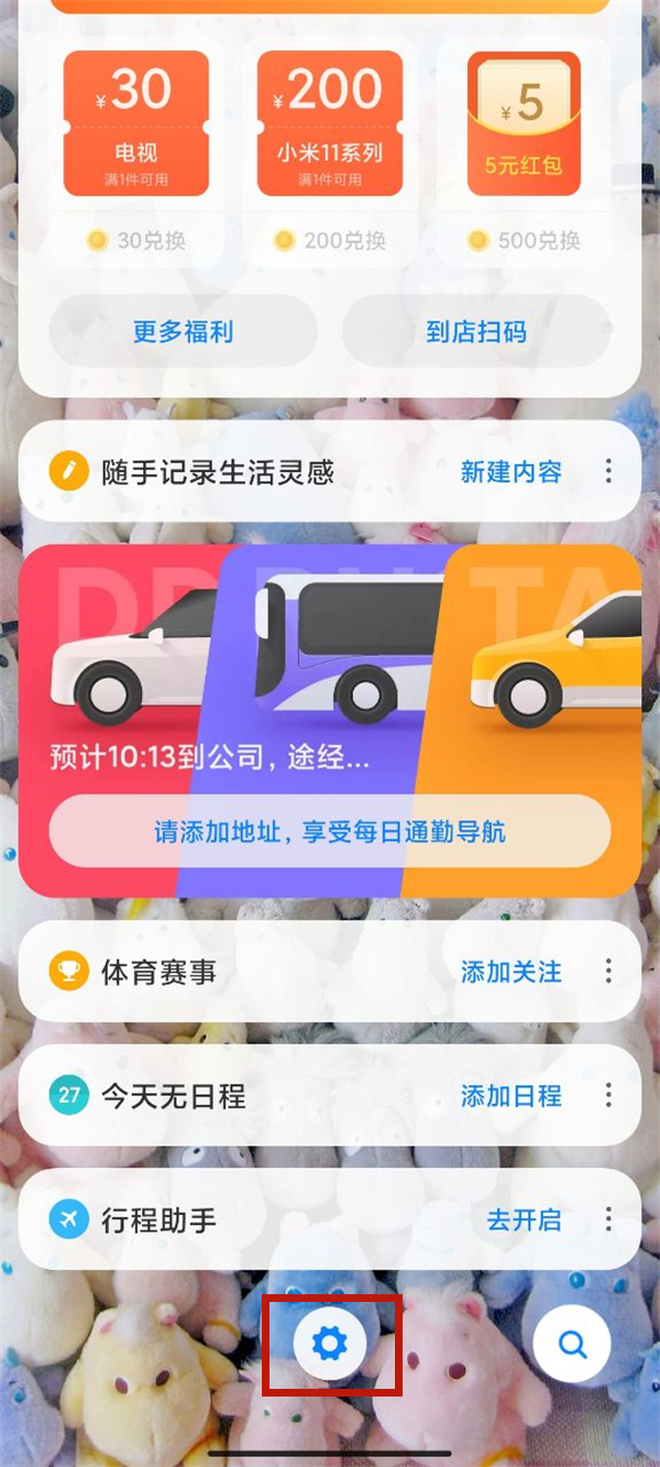 1、进入小米手机负一屏,点击最下方设置图标。