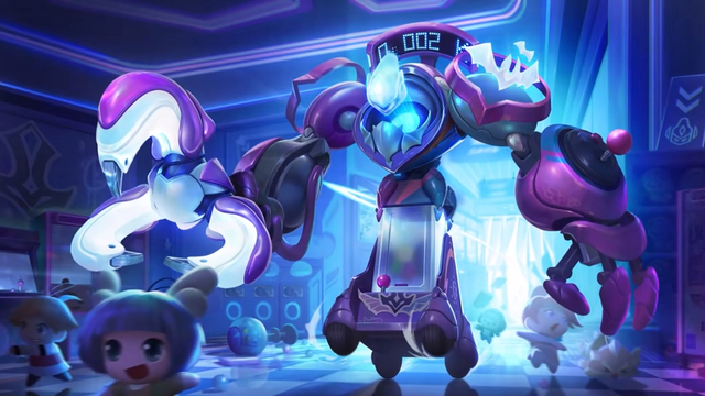 这款皮肤整体配色以冷色调为主,搭配相对尖锐的图形结构。通过玩具的感受进行设计——投影脑袋、娃娃机箱、操纵杆按钮、电线、灯牌等元素组成他的主体,更具趣味性。身体上布娃娃捣乱时留下的五彩涂鸦,以及肩膀上的小蝙蝠LED投影,渲染了午夜游乐园神秘奇幻的气氛。