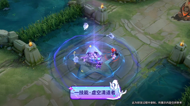 钟馗一技能是在原地释放的,而释放之后周身将会出现一圈圈荡漾开来的水波状的蓝色淡雾波纹,一圈一圈荡漾开去的同时还有着水波的纹路和光影,而且正中间部分则是一个透明的星星形状的图案,看起来非常的别致,而且还有各种可爱的玩偶飞翔于空中或者纹波中,甚至还有着星星月亮的图案在其中,整体看起来都非常的别致。