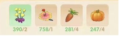 南瓜糖蔬叶饮=萤火草*2,毛毛花*1,胡萝卜*1,南瓜*4。