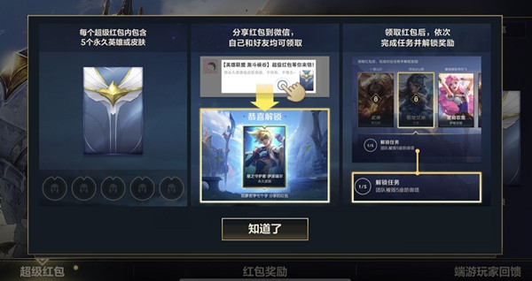 一共可以拿6次红包奖励,6次全部领完之后,总计包括4个英雄+2个皮肤