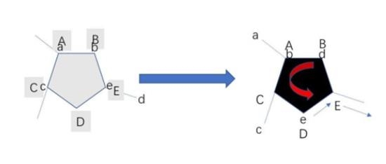 然后剩下的放进卡位如图右,先把e和a移开好给d让路,d出来之后再把e放进E下面那个卡位,然后剩下的就是b和d按照逆时针转到正确位置再把a放回去就解锁了