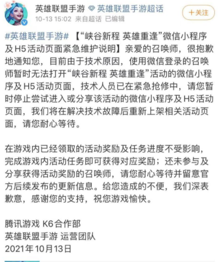 英雄联盟手游都发公告了:很抱歉地通知您,目前由于技术原因,使用微信登录的召唤师暂时无法打开“峡谷新程 英雄重逢”活动的微信小程序及H5活动页面,技术人员已在紧急抢修中。拜托,人家都说技术原因了还往哪里想呢?
