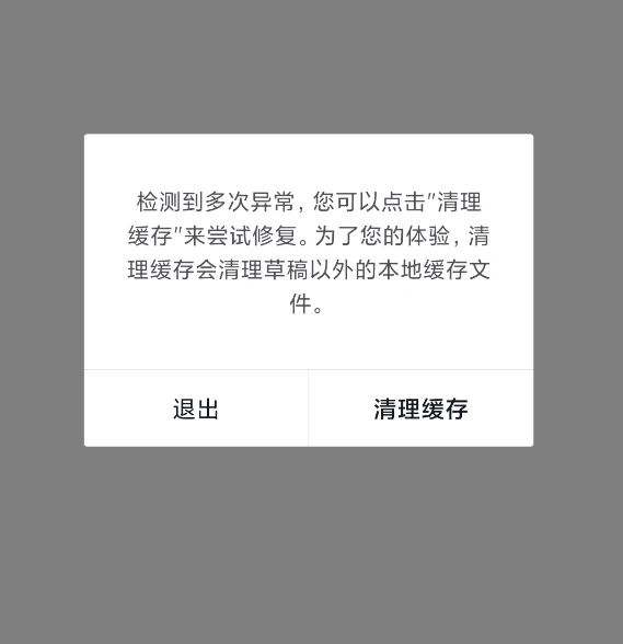 “检测到多次异常,你可以点击“清理缓存”来尝试修复。为了你的体验,清理缓存会清理草稿以外的本地缓存文件。”