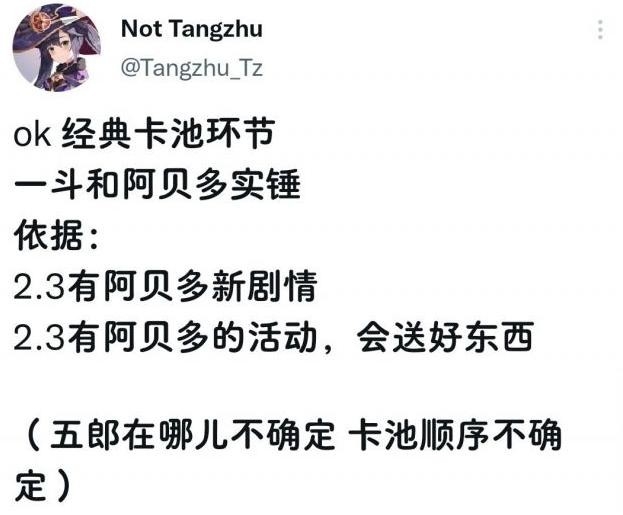 而阿贝多的复刻这个没有被证实,不过却是来自一个比较知名的内鬼消息,因为在2.3版本中阿贝多好像会有相关的新剧情,这对于阿贝多玩家来说是一个非常大的好消息,不过这也只能算是小道消息,玩家们看看就好,不要太过于当真,一切以正式服上线为准。