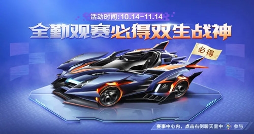 10月14日至11月14日期间,车手们在游戏内赛事中心观赛达指定时长可领取橙光能源、凯蒂祈愿卡等丰厚奖励,全勤观赛必得双生战神!