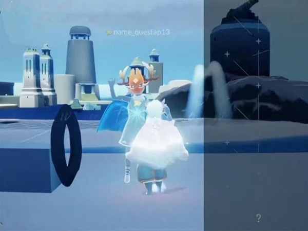 这样的蓝色,令人有点忧郁。 整个空间的色调,如同光遇霞谷千鸟城的白天版本,建筑物不多,应该还没做好,但麻雀虽小五脏俱全,除此之外,还有一个先祖的建模。该先祖戴着红狐狸面具,圣诞鹿角发型,身穿一件不认识的斗篷,从兑换树的布局来看,疑似未完成的季节向导。