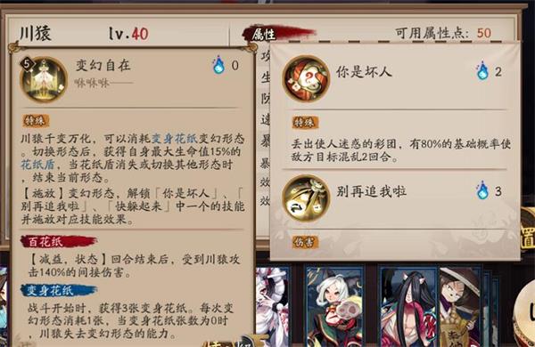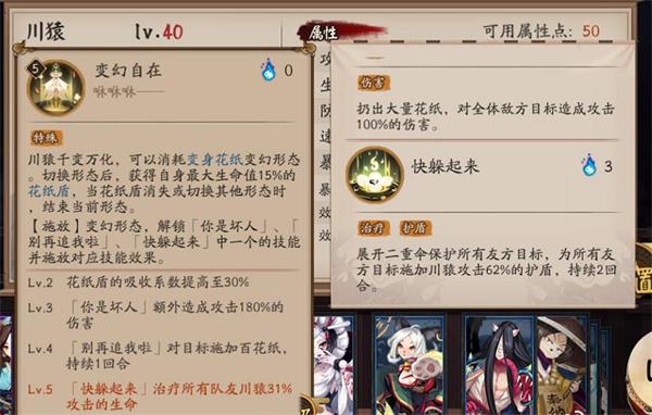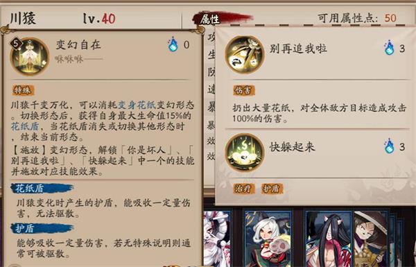 个人认为,SR川猿最大的特色,就是可以凭借3技能变化出3种大招,而每种大招的特色各不相同。可能是为了限制SR川猿的强度,策划特意封印了式神的被动,非要3技能的形态变化机会用光之后,才能解锁。
