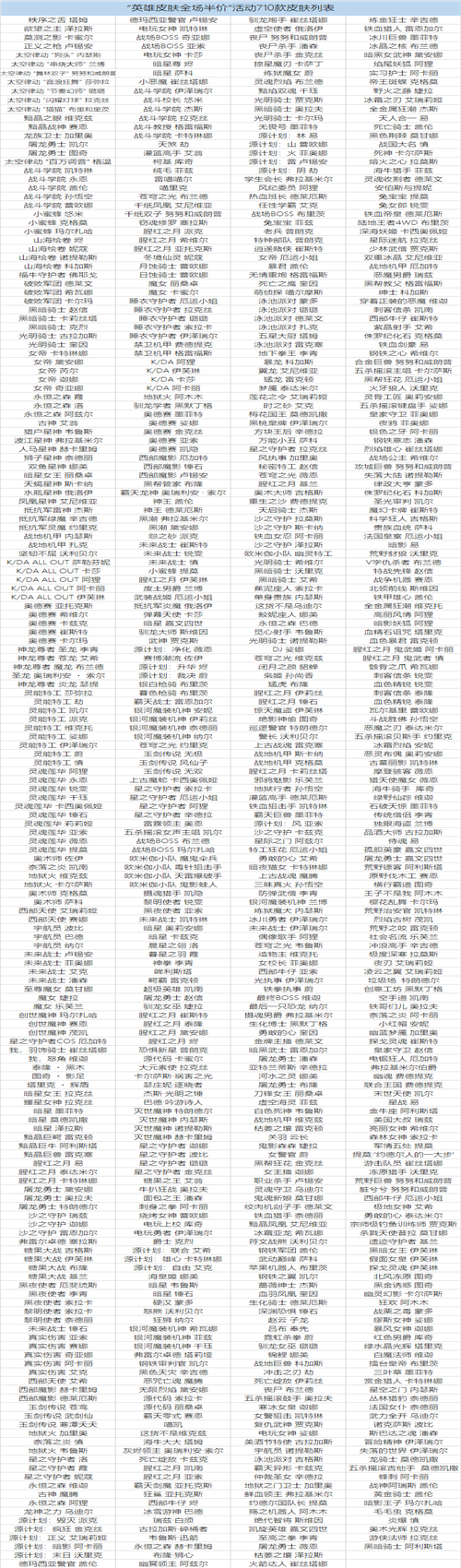 英雄皮肤全场半价活动710款皮肤列表详见文末附表