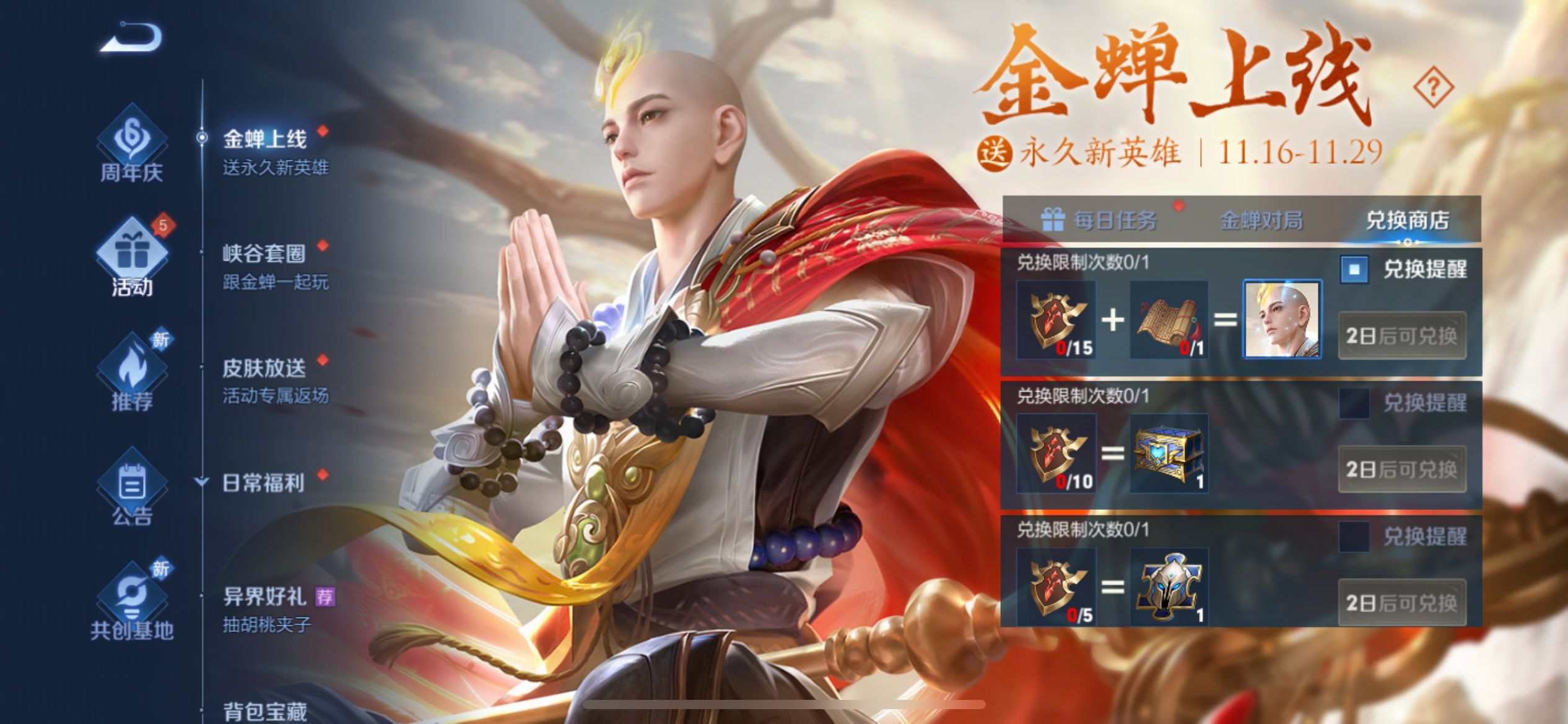 方式一:通过完成活动任务获取。完成任务收集15个渡世印记和1个金蝉信物即可兑换永久英雄金蝉。