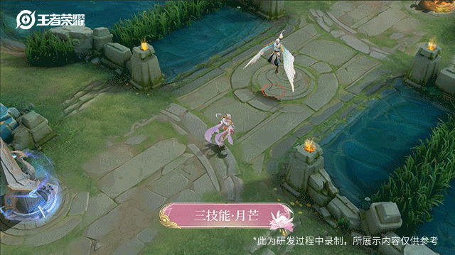 嫦娥—拒霜思的二技能特效:嫦娥释放二技能后,霜雾和花瓣围绕着嫦娥身上,同时地上层层绽放的芙蓉花法阵。