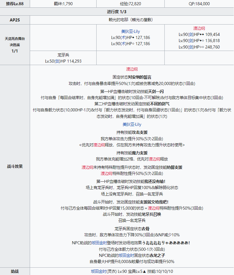 3条血渡边纲+双血条C子,C子会提供2格充能和攻击buff,渡边纲持有高额的减伤,而且还会召唤龙牙兵,渡边纲第一条血击破会赋予目标集中状态,之后再击破会一直持有满起草的效果,非常棘手,而且有持续回血效果,附带回避和毅力,一旦你的打手GG了就玩完了,整体难度还是很高的,你后排没有准备额外的打手,一群拐子是无法队持有高额减伤能力,同时附带有持续回血效果的渡边纲产生任何威胁的。