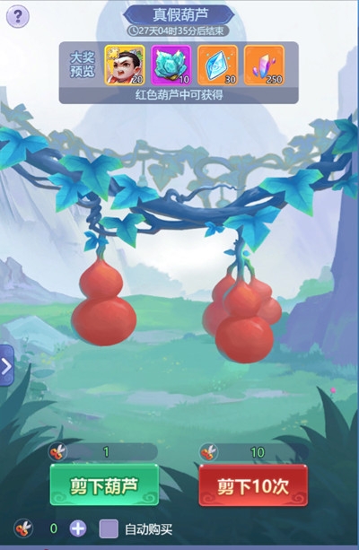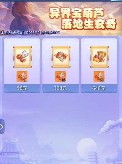 消耗剪刀可以抽葫芦娃(金卡),金法宝和无级别神装橙装(不推荐用仙玉,只推荐礼包)
