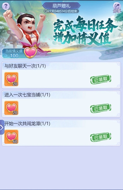 ②情义礼:积累情义值获得礼物(原则上每天完成任务就能拿满奖励)