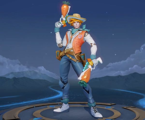 这款皮肤马可波罗的武器变成了两根胡萝卜,从形象上看起来非常有趣,这款皮肤的总体特效是橘黄色,毕竟是从胡萝卜里放出的技能,技能颜色和胡萝卜颜色一样。
