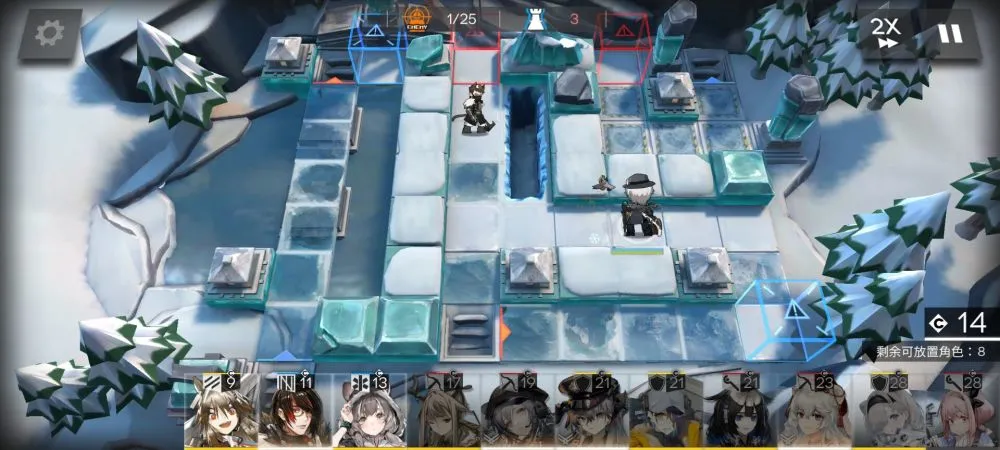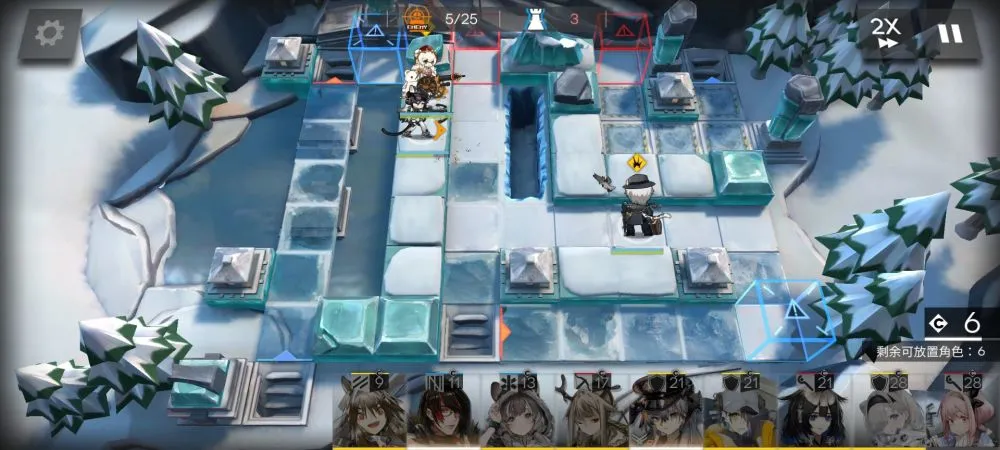 开局先部署银灰冲上攻击,然后等cost慢慢回复,如果你享用42姐的话,银灰可以考虑向左侧和右侧移动一格,当然不移动也没事,左上角部署早露,这个主要是用来针对飞机的,如果高台输出不够可以额外追加白金或者群狙也没问题。