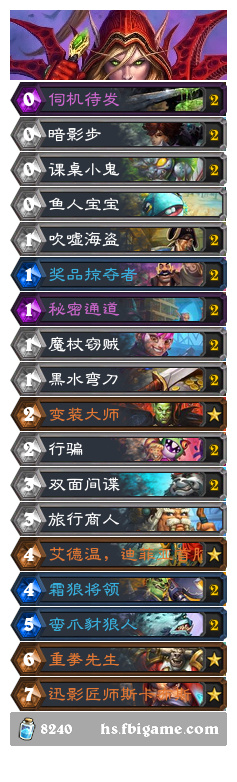使用的一套节奏贼,一路打到了前20他在原卡组的基础上将一张鱼人宝宝换成了课桌小鬼,因为这样能打出的combo更多。这套贼的曲线比较低,拥有很可怕的单回合爆发,作为节奏卡组在盗贼内战和对阵猎人骑士都有不错的效果,目前有取代剽窃贼的趋势,但是同时因为曲线过低,手牌很容易直接打空,喜欢节奏卡组的可以尝试一下。