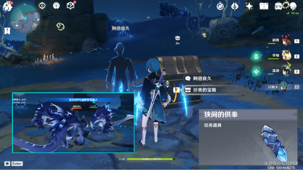 老规矩,放键纹,开启最终试炼。在30s内击败深海龙蜥(怪物血有点厚,建议上强输出角色),获得1个珍贵宝箱!再次与残魂对话,获得想【狭间的供奉】任务道具。