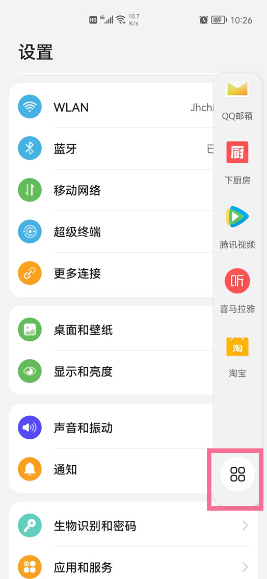1、将手指放在屏幕两侧并向里滑动,停留两秒即可呼出智慧多窗菜单栏,选择右下方四个方块的图标。