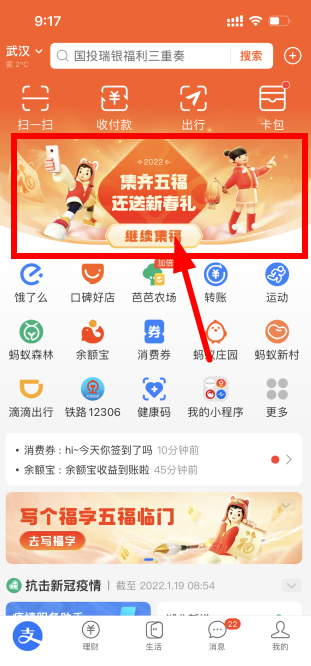 1,打开支付宝APP,在首页的位置直接进入集五福的界面: