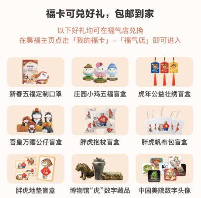 据介绍,「福气店」里还有过年换上了新衣的庄园小鸡手办,虎年胖虎和五福的联名款,数字藏品联合全国 17 家博物馆拿出了自己的宝贝…… 还有好多新的联名物品和新奇的玩法。官方表示,整个「福气店」价值接近 1.5 亿,而且所有东西用福卡就能换。