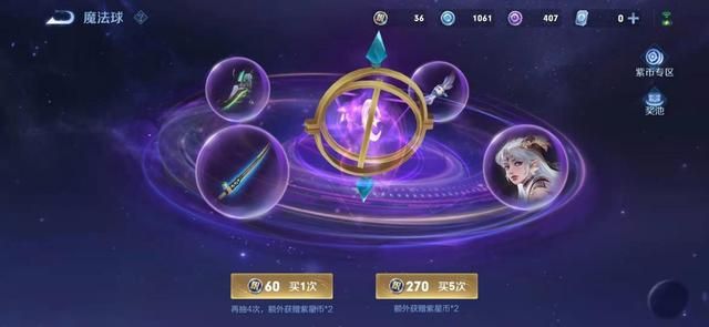 魔法球抽奖和积分夺宝一样,都是60积分一抽,300积分五抽,打折的时候270五抽,魔法球奖池的紫星币包括10、3、2、1个;