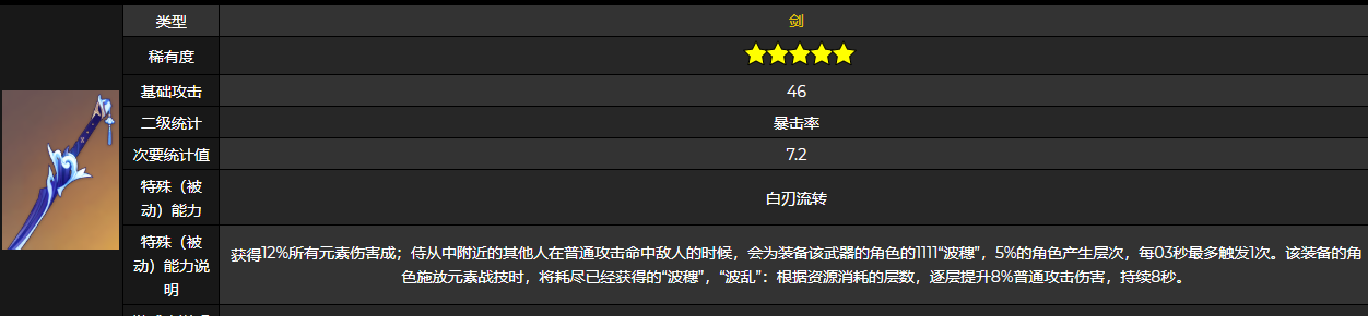 获得12%所有元素伤害加成;队伍中附近的其他角色在普通攻击命中敌人时,会为装备该武器的角色产生1层'波穗'效果,至多叠加5层,每0.3秒最多触发1次。装备该武器的角色施放元素战技时,将消耗已有的'波穗',获得'波乱':根据消耗的层数,每层提升8%普通攻击伤害,持续8秒。
