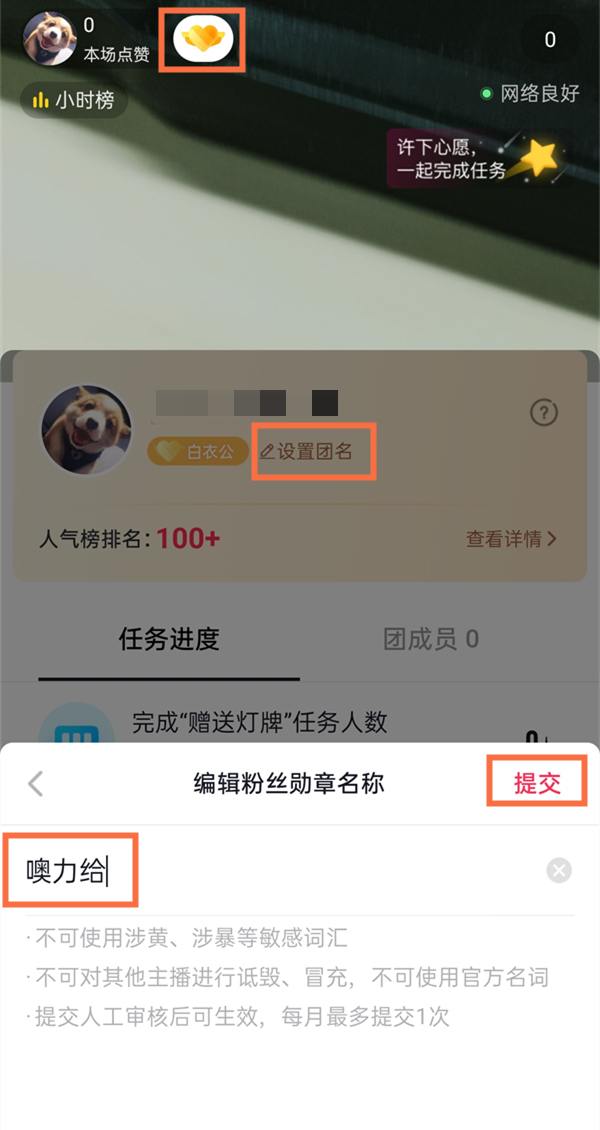 3、找到粉丝团图标后,选择团名,输入新团名后点击提交即可。