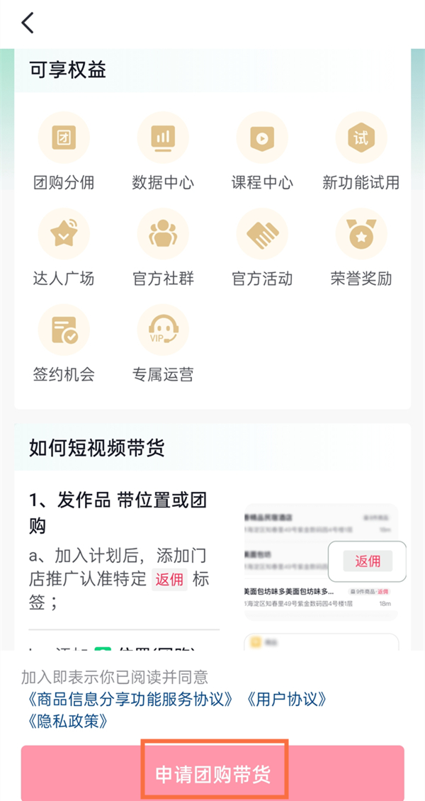 2、粉丝数量≥1000后,点击申请团购带货即可。