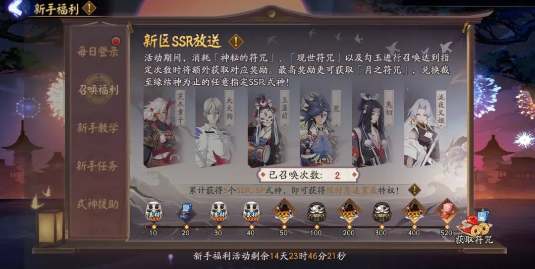 自角色创建起的30日内(不超过该新区开启后的45日),大人可使用「缘初符咒」召唤新手限定范围内SP/SSR阶式神,完成新区特定活动可免费领取大量「缘初符咒」。