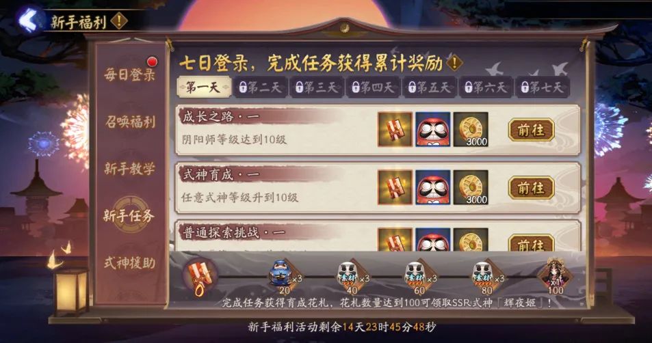 累计登录的前8天可按日获SR阶式神姑获鸟、高级觉醒材料、火灵高星御魂、四星达摩、御行达摩、随机SP/SSR式神等对应的珍贵奖励。